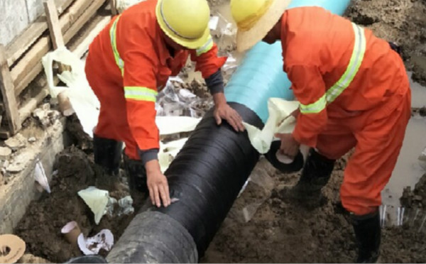 3、材料使用,采取纏繞方法進行。粘彈體膠帶軸向搭接≥10mm,粘彈體膠帶始末兩端搭接長度≥50mm,粘彈體膠帶與管體原防腐層搭接≥50mm;聚丙烯膠粘帶軸向搭接(膠帶寬度)≥50%,兩端包覆粘彈體膠帶防腐層各100mm。