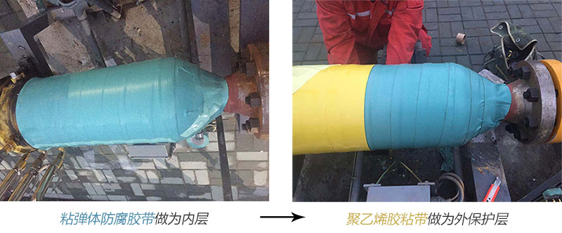 2018年度西氣東輸合肥站改造工程中整體埋地管路,閥室管件,地上高低壓分界點(diǎn)部位,選用了粘彈體防腐膠帶做為內(nèi)層防腐蝕主要材料,聚乙烯冷纏帶做為外保護(hù)層的工藝。效果非常好,一次性通過質(zhì)量驗(yàn)收。
