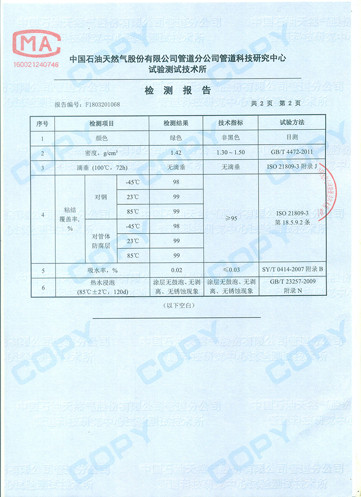 覆蓋率對PE23℃ 99%   對PE70℃ 99%   對PE-45℃ 98%   對FBE23℃ 99%   對FBE70℃ 99%   對FBE-45℃ 98%    對鋼23℃ 99%    對鋼70℃ 99%   對鋼-45℃ 98%